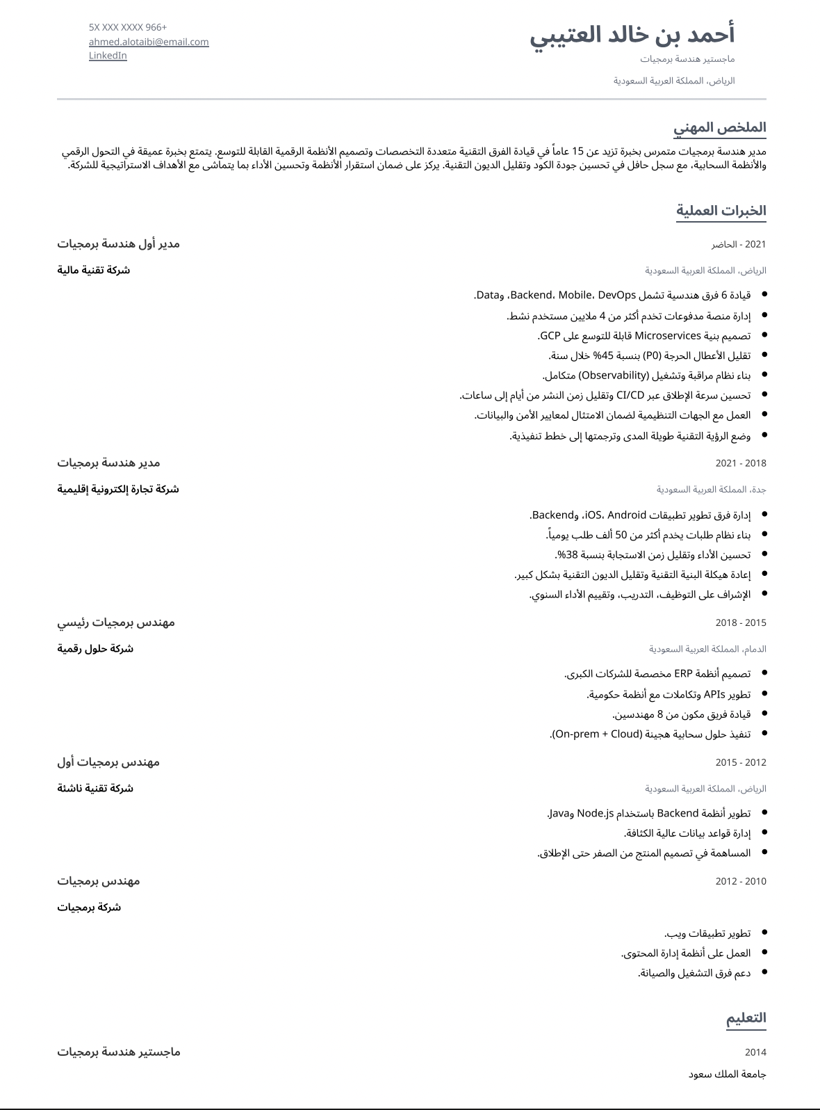 Use this template when applying to roles in Arabic-speaking countries or when the job description is in Arabic. It automatically applies when you set your CV language to Arabic in the editor. Perfect for Saudi Arabia, UAE, Egypt, Jordan, and other MENA markets where a right-to-left CV is expected.